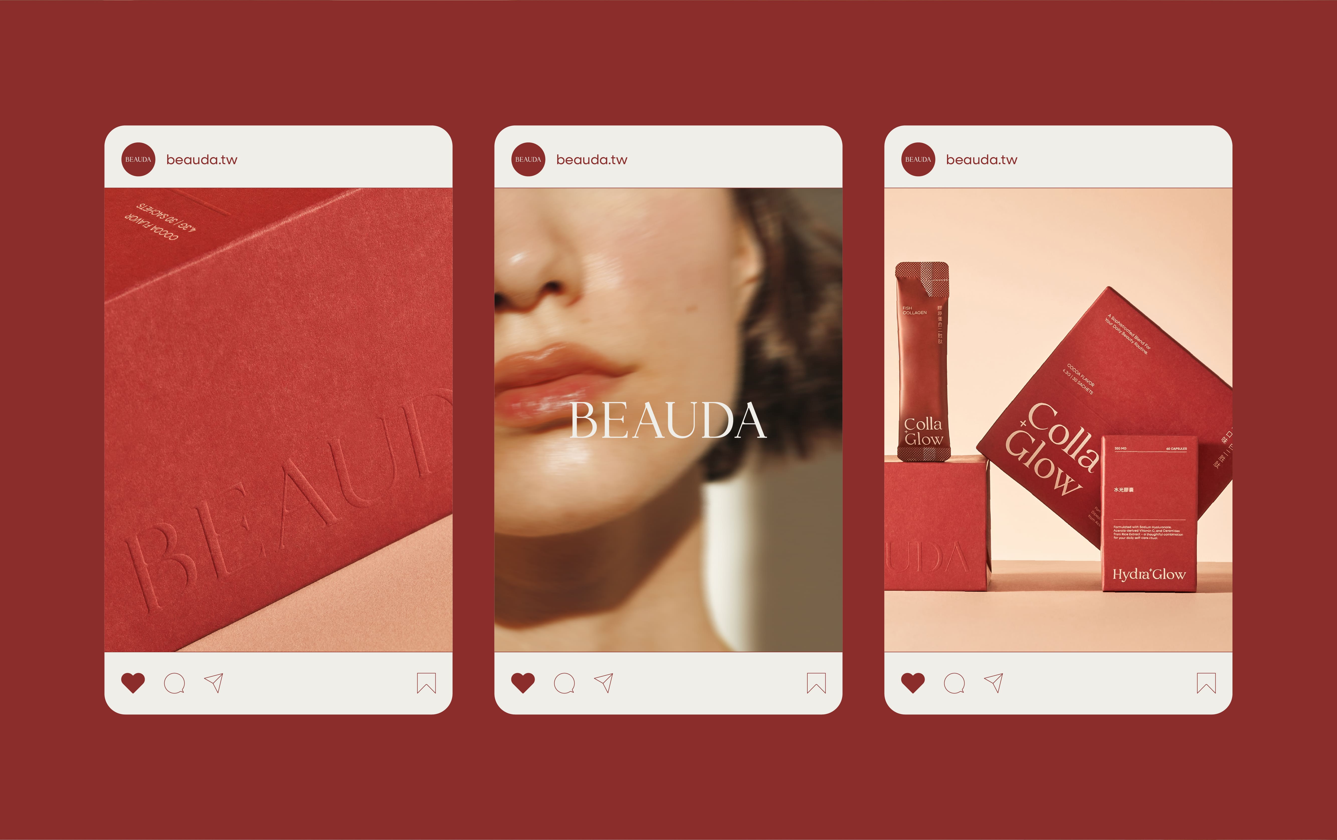 Beauda結合了“Buddha”的智慧與自覺,以及“Beauty”的自信與美麗,期待每個人能在快速變動的世界中,放緩腳步、好好擁抱自己最初始的美。Beauda標誌結構上,我們重新梳理每一個字母的比例與線條關係,使整體視覺更佳穩定而自信;不刻意強調力量,卻能長時間被注視。在圓角與直角之間取捨,刻意保留柔軟與理性之間的平衡。圓角不追求甜美,而是讓線條更貼近真實肌膚的觸感;由直線維持清晰結構,使字形在極簡中仍保有內在張力。在筆畫粗細與轉折處,我們避免過度修飾,讓線條在細節中保留呼吸感與留白,象徵 BEAUDA 對「不過度添加」與「真正有益」的堅持,整體收斂了多餘曲度,使外型更為內聚、節制。BEAUDA 所相信的美,不來自外界標準,而來自對自身狀態的理解與覺察。安靜而穩定的存在感,不急於被看見,卻能長久陪伴。“ Feel good, be confident, stay you. “
