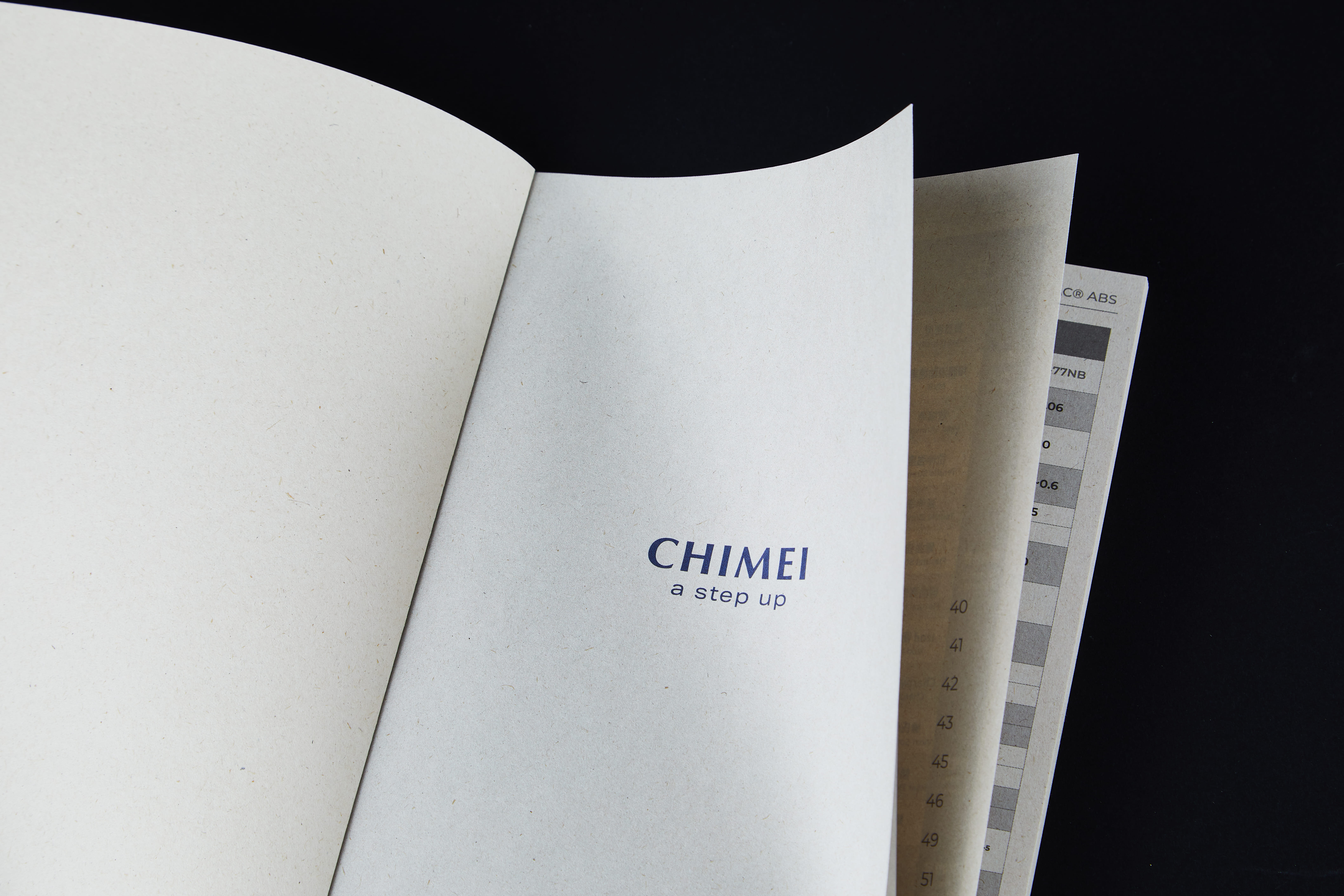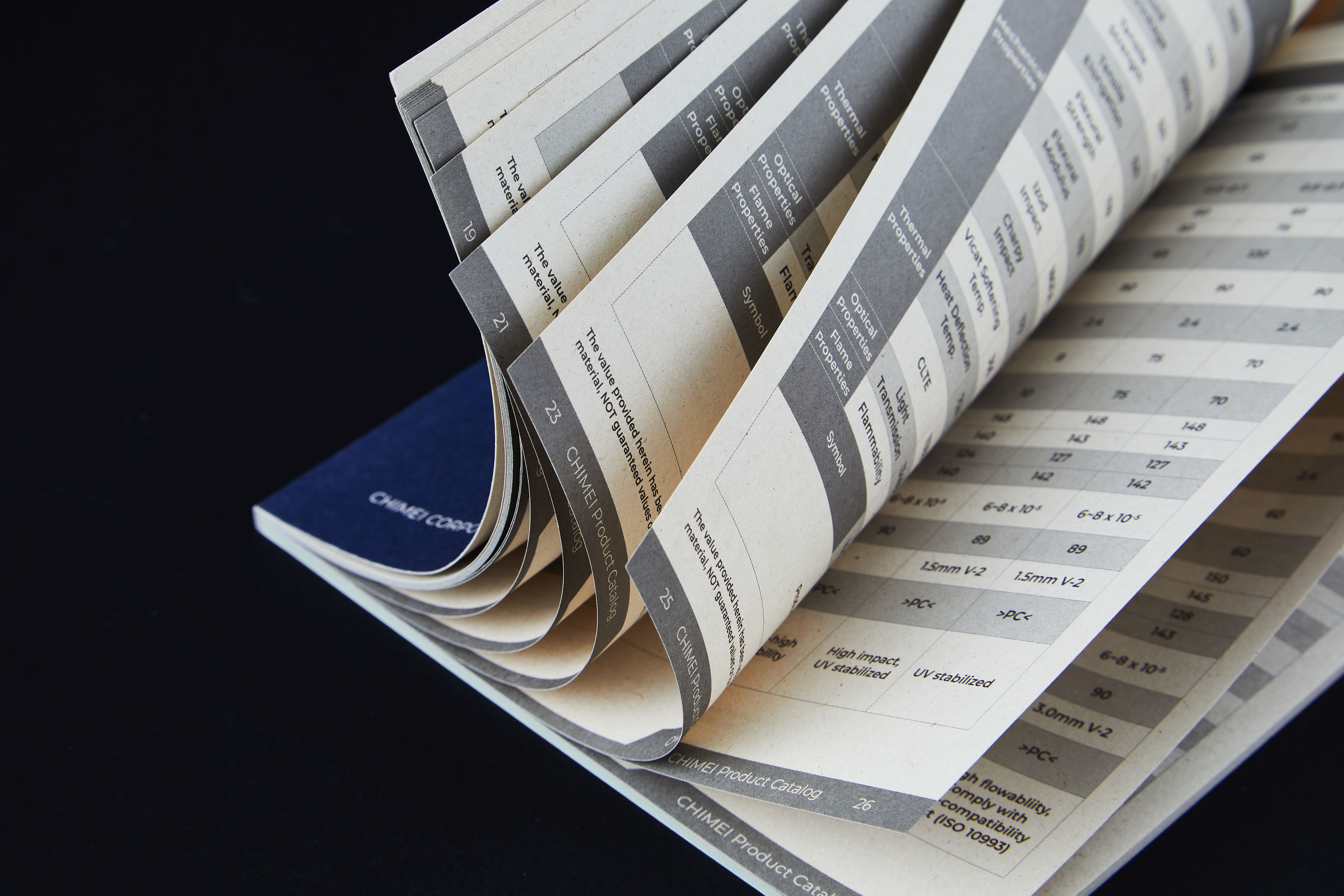 For print production, bagasse paper was selected for its natural fiber texture and low-glare surface, enhancing readability across information-dense technical content while reinforcing the brand’s commitment to sustainability. The visual system and paper choice work in harmony, building a cohesive and mature identity that aligns professional communication with CHIMEI’s brand values.